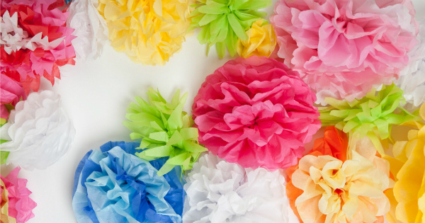 As guirlandas de papel crepom são uma maneira divertida de decorar. Faça uma guirlanda de flores ou um arco-íris de cores. Elas podem ser penduradas na entrada ou em torno da mesa do bolo.